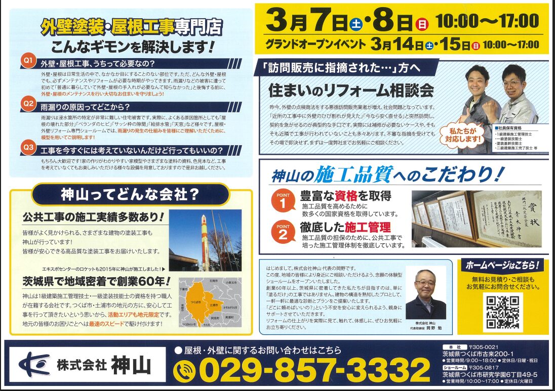 このたび株式会社神山では、つくば市研究学園に 屋根・外壁塗装のショールーム をオープンする運びとなりました。